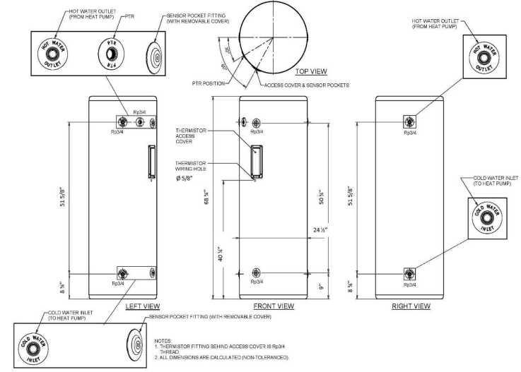 - Multiple temperature sensor wells (top, middle, bottom) for accurate heat pump control
