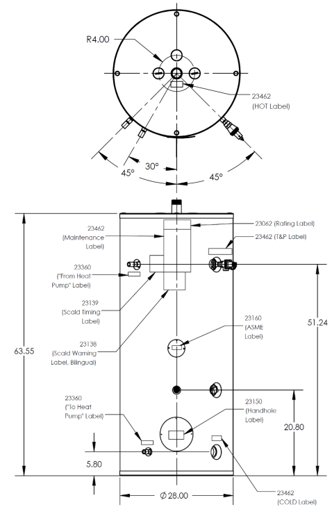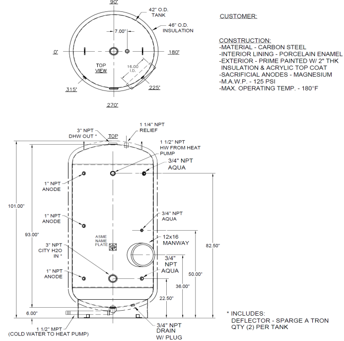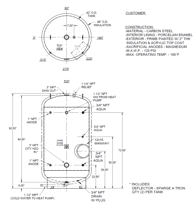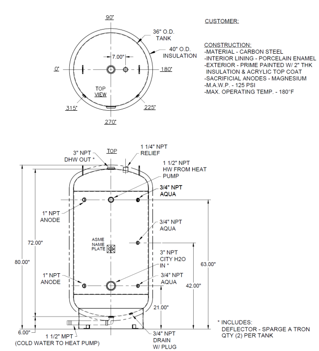 The ECO-285GLNSD is a 285-gallon ASME-certified storage tank constructed from carbon steel with a baked-on Ultonium™ porcelain enamel lining for superior corrosion resistance. It features 2¼”–2½” of spray-on foam insulation (R16) with an acrylic topcoat for indoor or outdoor installation, meeting California Title 24 efficiency standards. Designed for use with GS4 and GS5 heat pumps, the tank includes multiple temperature sensor wells, three magnesium anodes, and a 125 psig ASME pressure relief valve. With durable construction and efficient heat retention, it ensures reliable hot water storage and long service life.