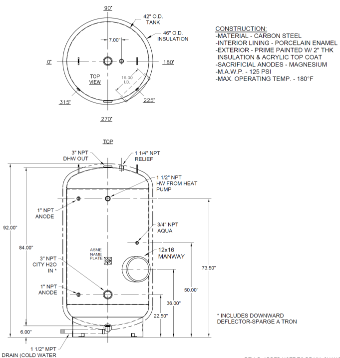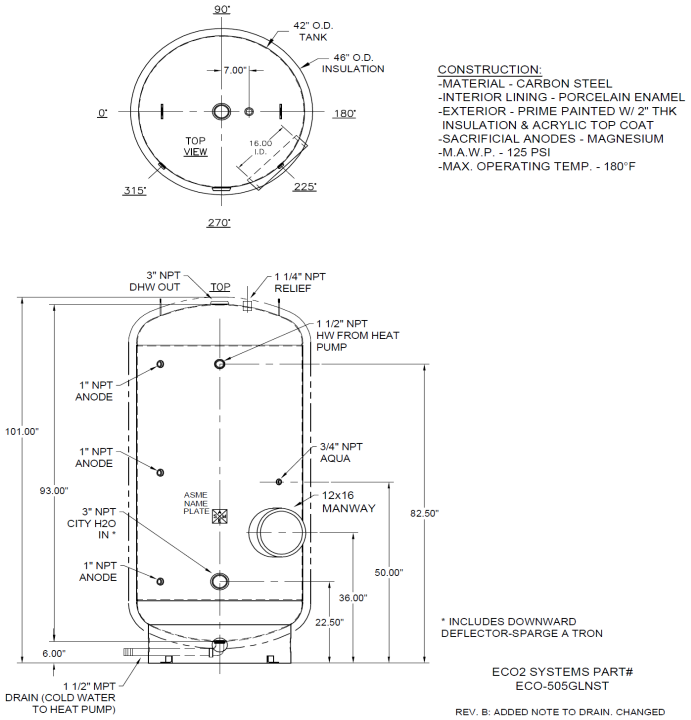The ECO-360GLNSD is a 360-gallon ASME-certified storage tank built from carbon steel and coated with a baked-on Ultonium™ porcelain enamel lining for long-lasting corrosion protection. It features 2¼”–2½” of R16 spray-on foam insulation with an acrylic topcoat suitable for both indoor and outdoor installation, meeting California Title 24 standards. Designed for use with GS4 and GS5 heat pumps, this tank includes multiple sensor wells, three magnesium anodes, and an ASME-rated 125 psig pressure relief valve. Its durable construction and high-efficiency insulation deliver reliable hot water storage performance for commercial applications.