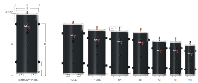 With enhanced polyurethane insulation, BuffMax standard models (20–120 gallons, non-ASME) are compatible with both heating and chilled water applications, offering efficiency and versatility in a single product. Each unit is backed by a 5-year warranty on the tank and a 2-year warranty on mechanical parts.